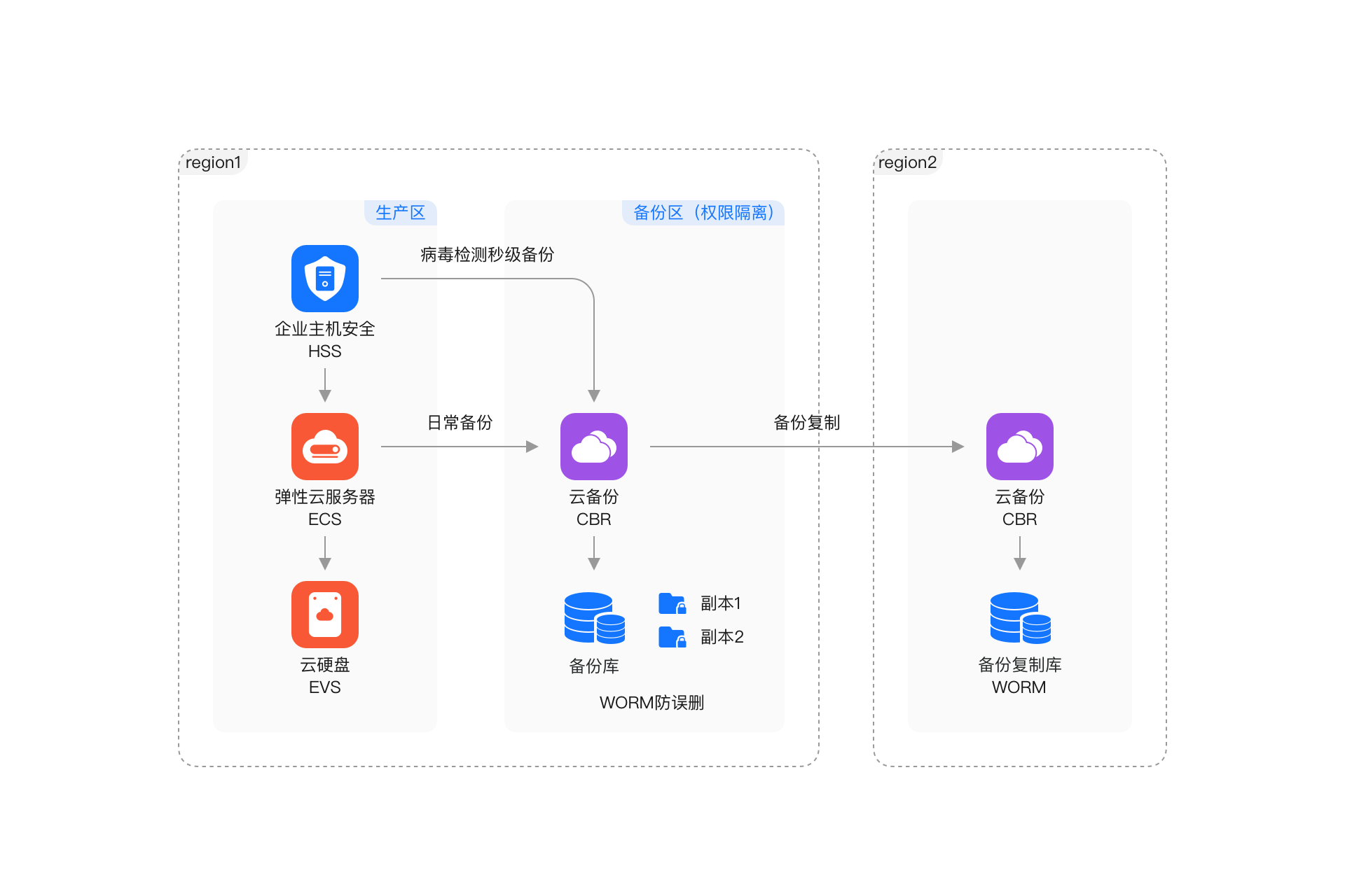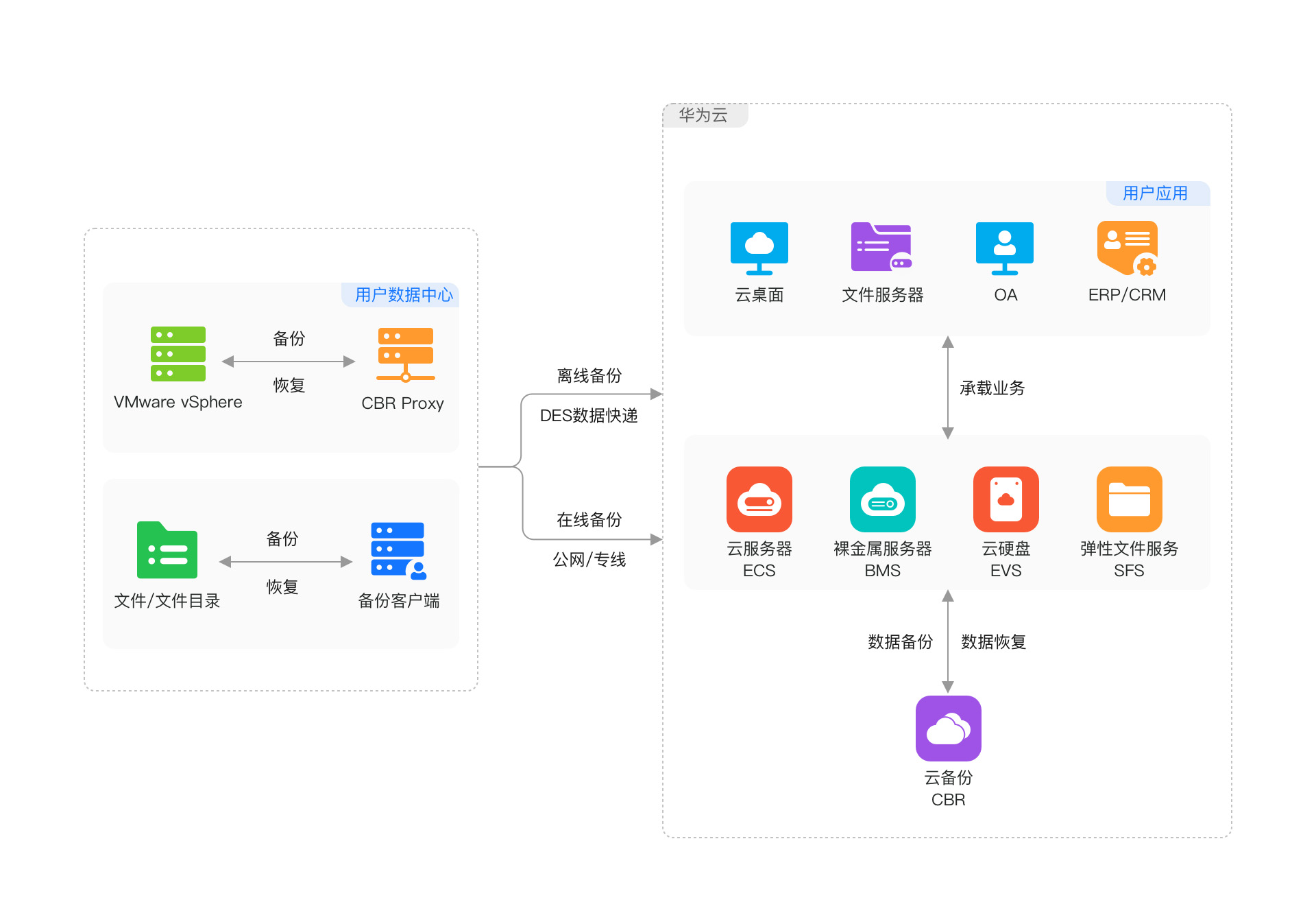 针对病毒入侵、人为误删除、软硬件故障等场景,为华为云服务器、云硬盘、云数据库、云桌面、SFS Turbo、云上及本地文件目录,VMware虚拟化环境,提供统一的备份服务