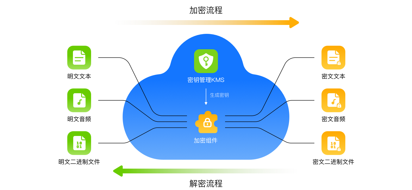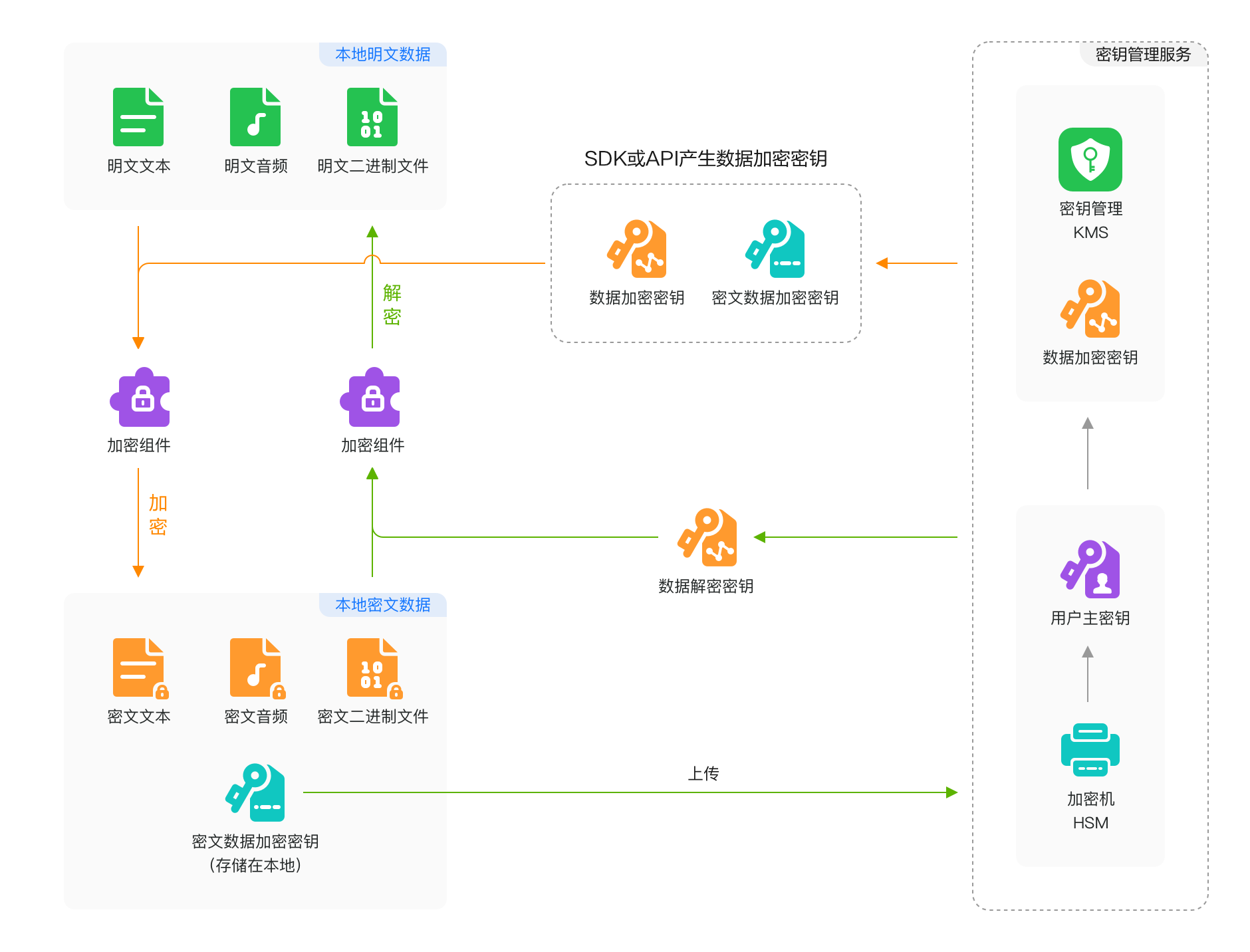 当客户需要对本地文件进行加密存储或传输时,密钥管理服务KMS提供信封加密技术,客户可以把KMS API/SDK集成到本地业务系统中,由KMS负责密钥的生成和交换,保障本地文件数据的安全性和加密效率。