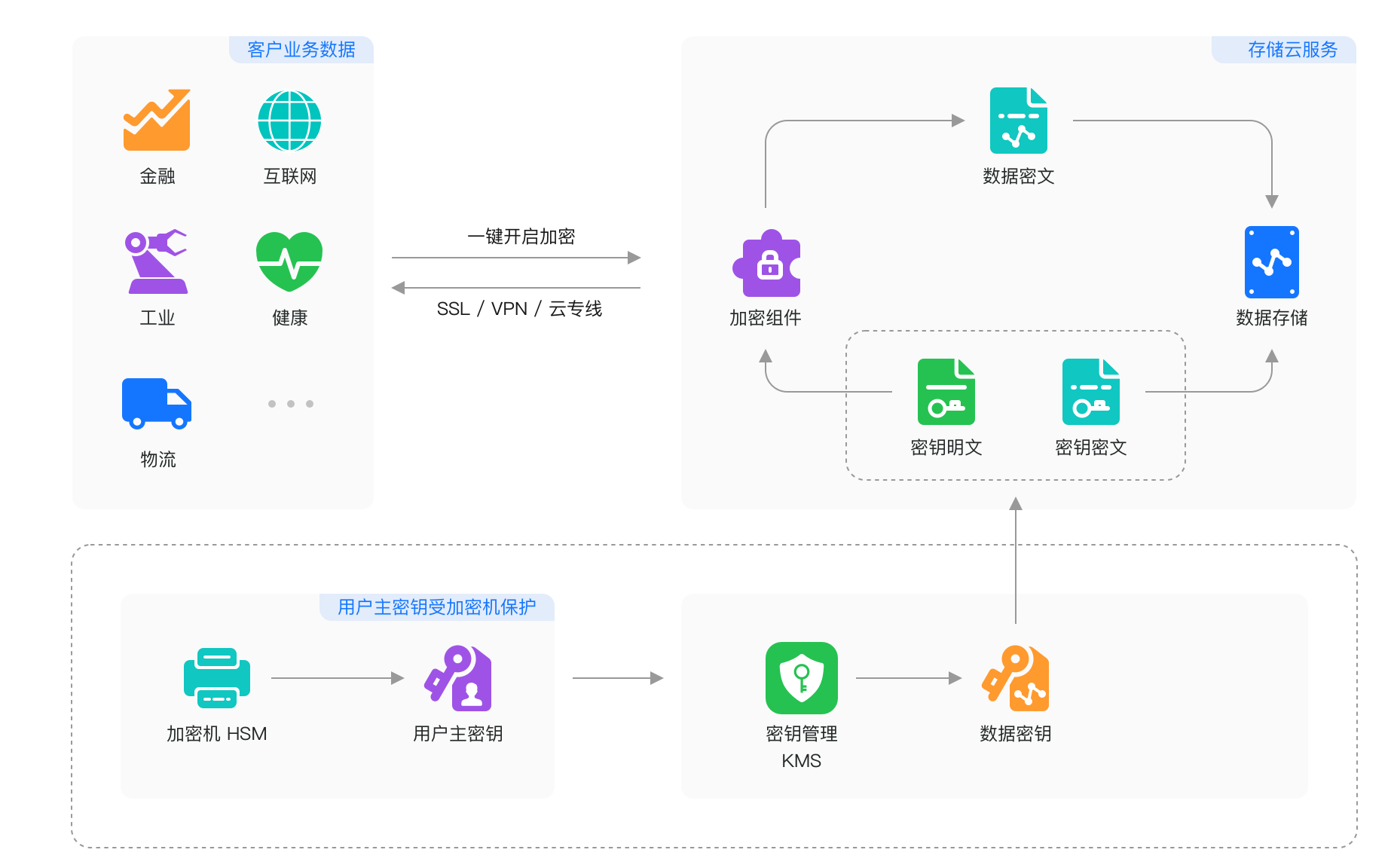 用户无需购买硬件加密设备,通过控制台或者API的方式实现密钥易用、易管理,满足业务多样性