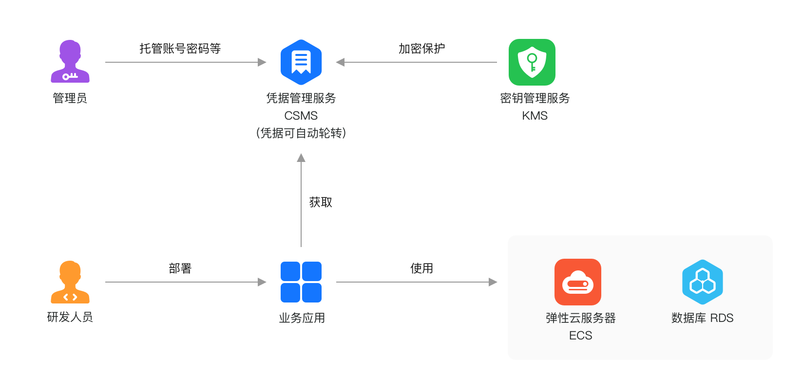 凭据管理服务CSMS支持创建、检索、更新、删除凭据,帮助用户或应用程序实现对敏感凭据的全生命周期管理,有效避免程序硬编码或明文配置导致的敏感信息泄露以及权限失控带来的业务风险。