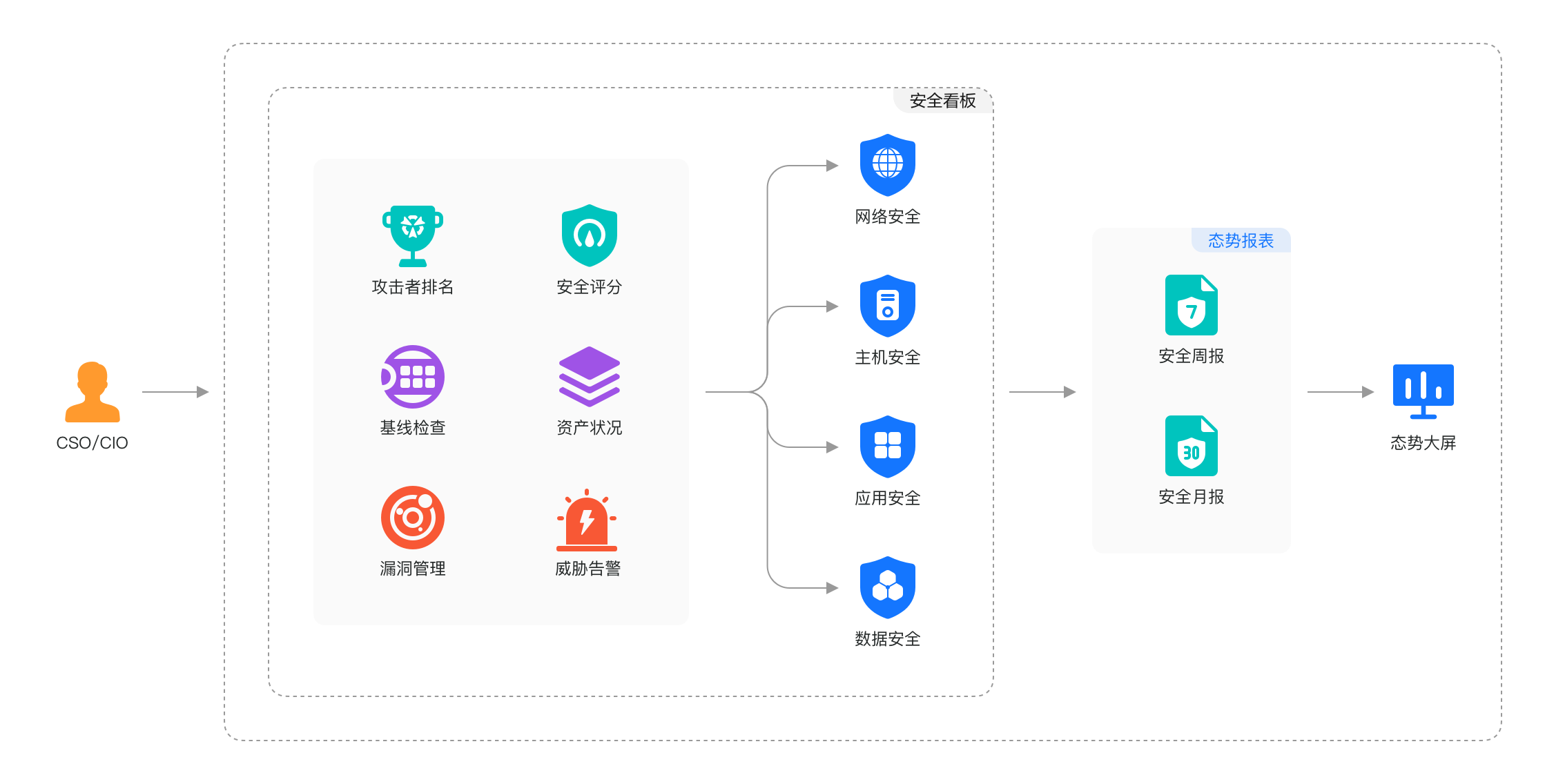 在CSO/CIO/CISO日常工作和上级汇报中,需明确安全投资及其价值,通过威胁态势大屏呈现,掌握云上各类资产风险全貌,满足企业高层对其云上业务风险水平尽在掌握的需求